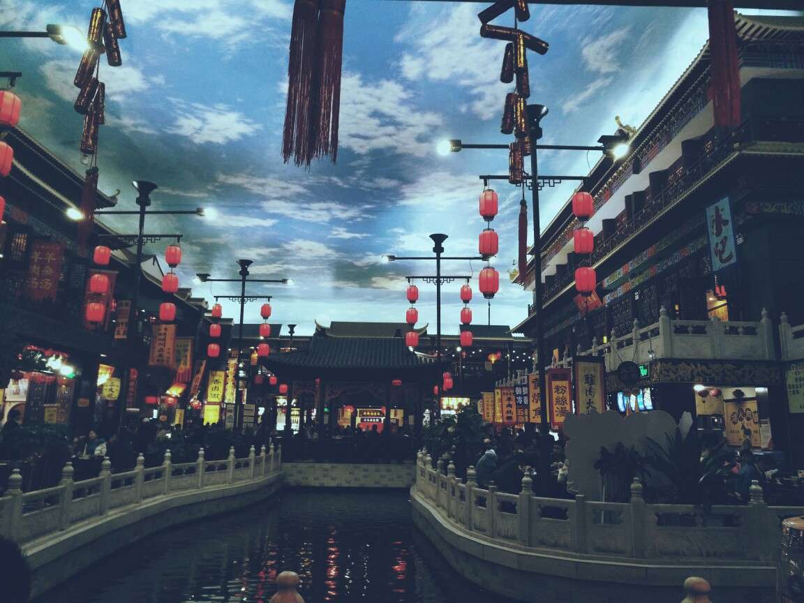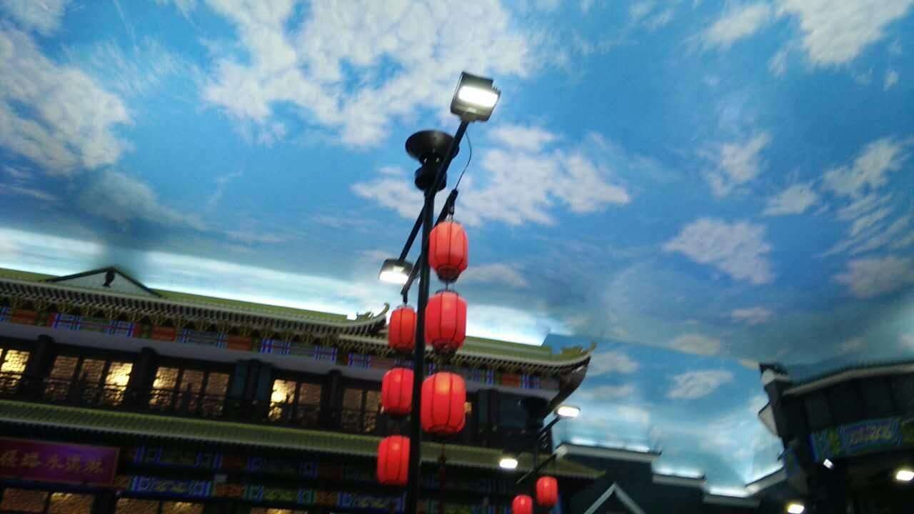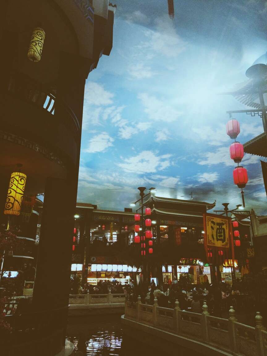 抬起頭,房頂噴繪的藍(lán)天白云,加上周圍小吃攤販身上的古裝,制作木板年畫的老師傅縱橫的皺紋,以及路邊一排繡娘手中的銀針,讓來者一時忘憂。