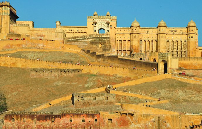 坐落在齋普爾的琥珀山山坡上的一座土黃色城堡,含比較濃厚的伊斯蘭教建筑風(fēng)格,歷史上印度曾長期定都于此,古堡依山傍河而建,由眾多獨(dú)立宮殿組成,其中有著名的Sheesh Mahal(鏡宮)和Jaigarh(杰加爾堡)。