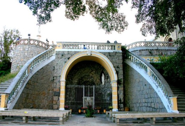 教堂前是一片寬廣平臺,平臺盡處豎立一尊大理石雕刻而成的圣母像,圣母雙手合十,貌甚慈祥,面臨大海。平臺下有一路德圣母巖洞,版權(quán)所有山東聊城聊之旅國際旅行社有限公司,轉(zhuǎn)載必究!循左右環(huán)抱之石階而下,即達洞前。洞內(nèi)巖石嶙峋,中開拱門,內(nèi)立圣母像,象征古時圣母在法國路德城內(nèi),當眾顯靈的情景。其間正置祭壇,洞前有鐵柵圍繞,地上設(shè)有多排低矮的長石板,供教徒跪拜,懺悔。