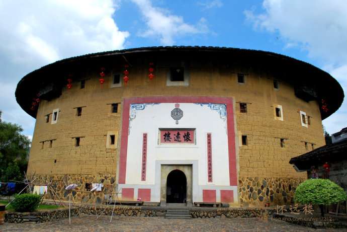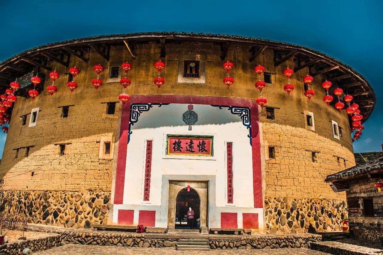 懷遠(yuǎn)樓是雙環(huán)圓形土樓,簡氏家庭住宅,建于清宣統(tǒng)元年(1909年),坐北朝南,占地1384.7平方米,高4層,1 4.5米,每層34間,共136間。樓門上有楹聯(lián)“懷以德敦以上藉此修齊遵祖訓(xùn),遠(yuǎn)而山近而水憑茲靈秀育人文”。懷遠(yuǎn)樓最引人注目之處,在于內(nèi)院核心位置的祖堂也就是家族子弟讀書的地方“斯是室”。