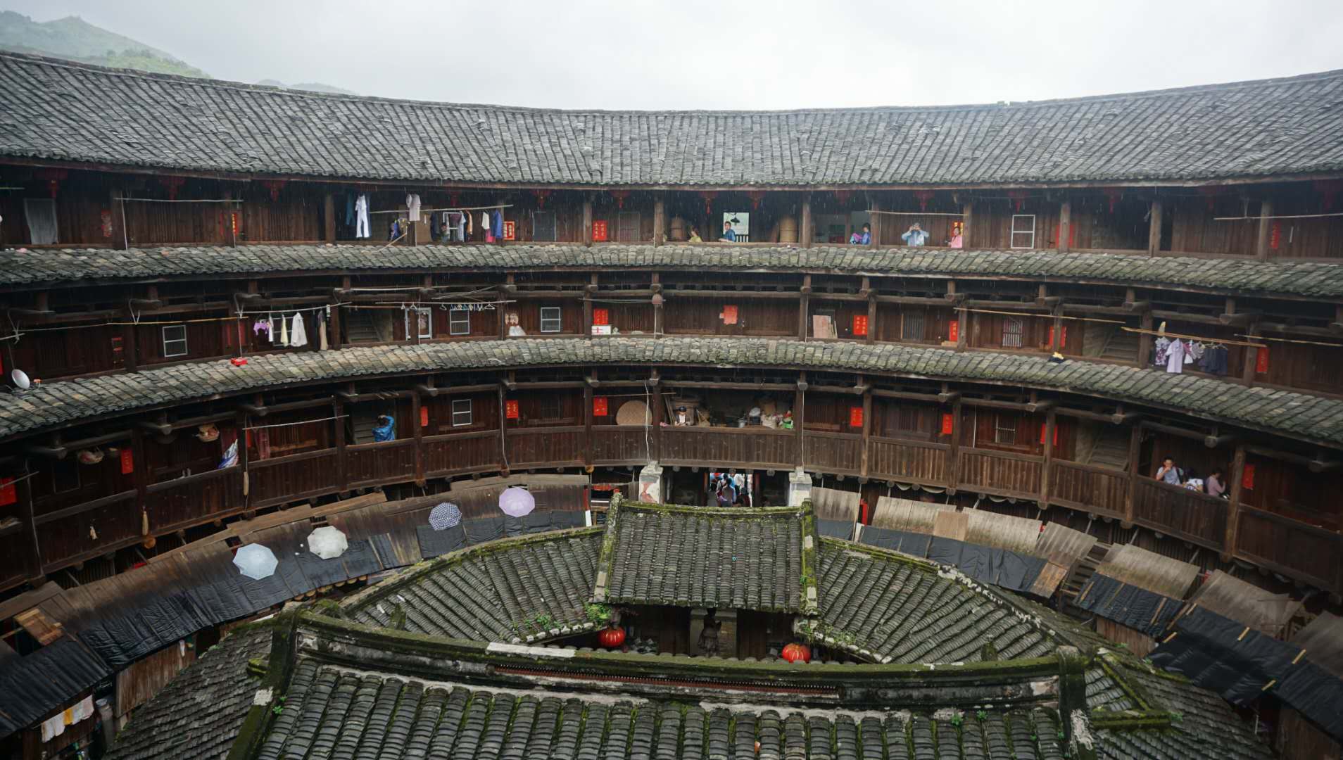 土樓建筑的另一特色是結(jié)構(gòu)極為規(guī)范,房間的規(guī)格大小一致。大多數(shù)土樓均只有一個大門供出入,樓內(nèi)均有天井,可儲半年以上糧食,猶如一座堅固的城堡,易于防盜和防匪(舊時客家人常遭匪患,故壘筑高大土墻以防不測)。由于墻壁較高較厚,既可防潮保暖,又可隔熱納涼,優(yōu)點甚多??图胰私ㄍ翗菚r,將煙囪砌入土墻內(nèi),使廚房免受黑煙污染,十分潔凈。