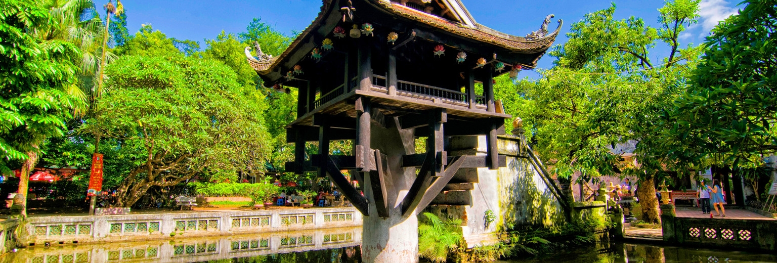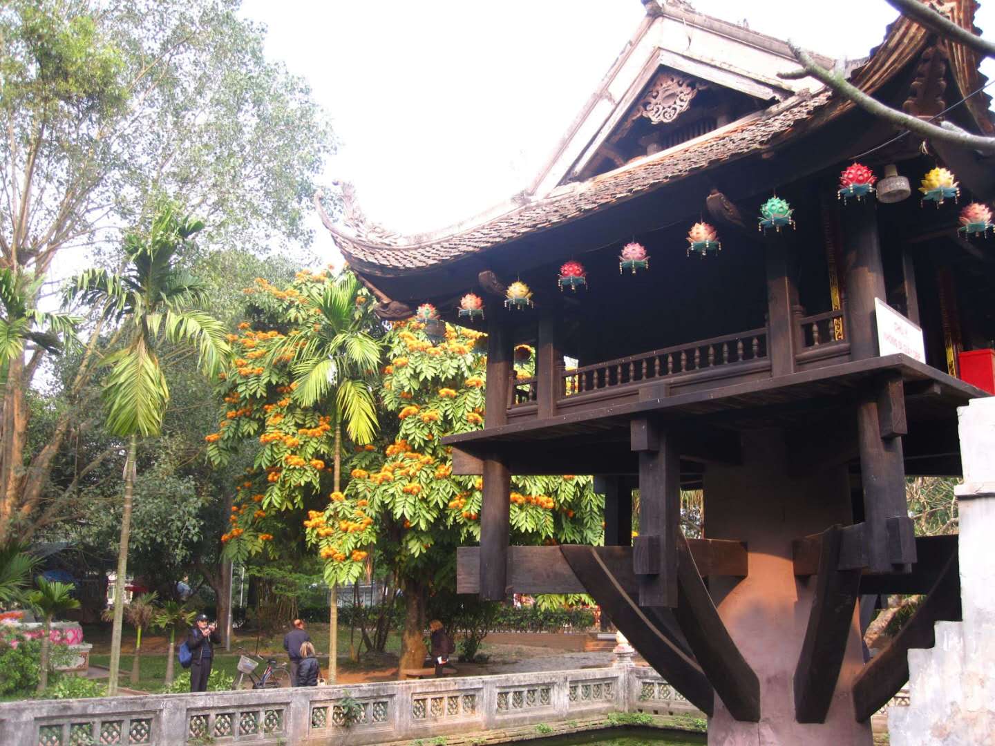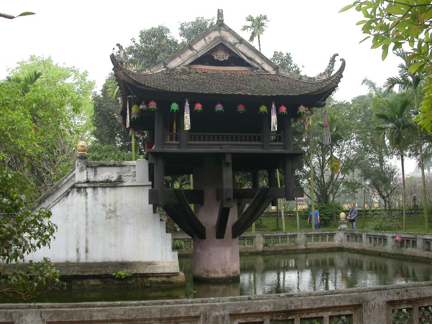 獨(dú)柱寺是越南獨(dú)具一格的古跡之一,位于河內(nèi)巴亭廣場西南,因建在靈沼池中一根大石柱上而得名。據(jù)傳1049年的李朝李太宗夢(mèng)見觀音菩薩手托嬰兒,立于水池蓮花臺(tái)上。不久李太宗老年得子,乃下令仿出水蓮花建寺,故獨(dú)柱寺似出水蓮花。原寺1954年法國撤軍時(shí)被炸毀,僅存石柱。1955年在原址依原樣重建。規(guī)模小于原建,但其藝術(shù)風(fēng)格仍舊保留。