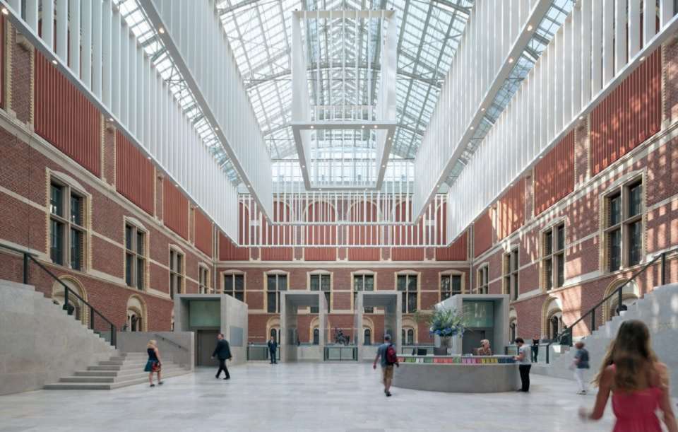 而我們今日所見的哥德教堂式的博物館大樓,乃建于1885年。博物館的面墻上全部飾以荷蘭歷史與藝術(shù)的圖像,面朝博物館廣場的南面,是彩色玻璃鑲嵌,描繪著阿姆斯特丹文化生活中重要人物的肖像。