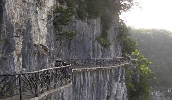 據(jù)施工人員介紹,此條棧道也是他們所修棧道中施工最難,最險(xiǎn)峻的一條。如果您還覺得不夠刺激的話,在棧道的完結(jié)處的兩個(gè)懸崖之間有一條長160米的懸索吊橋,同時(shí),在海拔最高點(diǎn)還有一個(gè)挑戰(zhàn)心里極限的玻璃站臺(tái),在這里,如果你能挺直腰板伸開雙臂,那么,您就是真正的勇士了。