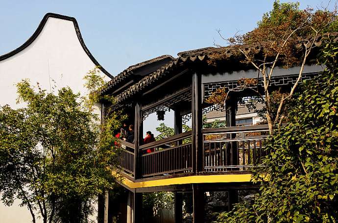 園中有書齋二處,分別以友于和海棠為名,尤其友于書屋,地處幽偏,經(jīng)曲折長廊,過清蔭居和靜中觀,方可蜿蜒而至。友于書屋為自成一體的獨立庭院,前院湖石數(shù)片,花木扶疏,室內(nèi)經(jīng)典古籍,書香飄溢,實在是一個專心攻讀的“藏修密處”。在嚴家花園幽曲靜美的環(huán)境中,友于書屋等建筑偏居一隅,清幽曲奧,具有幽人般的情致;與其迥然有異的是,另有一些建筑如眺農(nóng)樓、見山樓、環(huán)山草廬、宜人亭、延青閣等則地處高曠,空間暢豁,具有曠士般的襟懷。憑欄極目,不但園中景致盡收眼底,還可看到園外的田野風(fēng)光和靈巖山的滿目蒼翠。延青閣上一副對聯(lián)概括了這一切:“閣鄰佛寺經(jīng)盈耳,窗對靈巖翠滿晴”。嚴家花園還有一些建筑造型頗為別致,在蘇州古典園林中頗為罕見。如延青閣后墻與圍墻不在一線,陡然偏斜出一角,打破了平穩(wěn)板律的局面,使人產(chǎn)生無限遐想。聞木樨香堂為廳榭合一式建筑,前部水榭依水而筑,數(shù)魚為樂,后部四面廳光明洞徹,盡收四周景色于窗欞之內(nèi)。羨園東部的爬山廊也較罕見,此廊依地勢而建,隨地形升高,連接自然,造型優(yōu)雅,使人在不知不覺中從平地漫步至環(huán)山草廬的二樓。