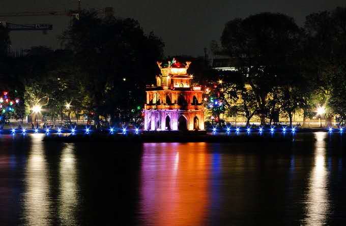 湖岸四周樹木青翠,濃蔭如蓋。湖水清澈如鏡,幽雅嫻靜,平均水深 1.5 米左右。岸邊伴有筆塔、和風(fēng)塔、水榭等古建筑,水中有玉山祠、棲旭橋、鎮(zhèn)波亭和龜塔等勝跡點(diǎn)綴,是河內(nèi)第一風(fēng)景區(qū)。