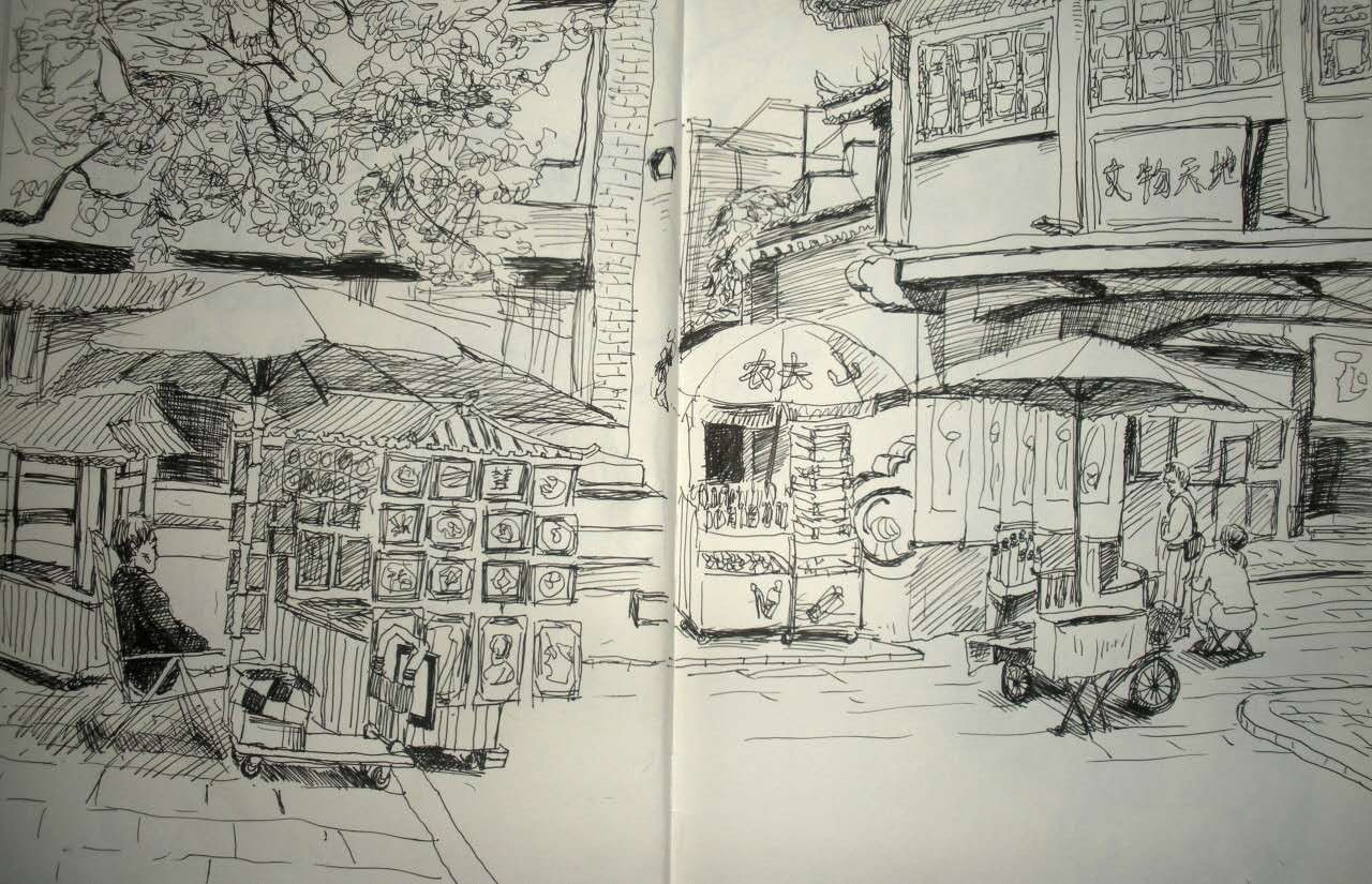 從南大街走到這條街上,忽然好像一下子安靜了下來(lái)。路兩邊,高大的槐樹(shù)后面,紅漆格子門(mén)半開(kāi)著,大大小小的湖筆從門(mén)檐上面垂下來(lái),后面是一張怡然自得的臉,表情似曾相識(shí)。青石板的路面緊貼著鞋底,松動(dòng)的地方發(fā)出清脆的烏烏聲。潑墨山水掛在城墻的青磚墻上,斑駁的陽(yáng)光灑在上面,隨風(fēng)輕輕抖動(dòng)。