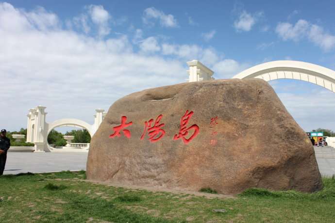 太陽(yáng)石:在太陽(yáng)島東區(qū)入口處,矗立著一塊長(zhǎng)7.5米,厚2米,高4.3米,重150噸的天然奇石,這就是太陽(yáng)石。奇石出于金源故地。