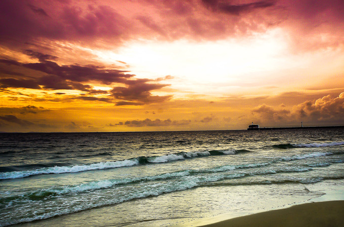 位于西哈努克城的西北角,勝利海灘超過2公里長(zhǎng),被礁石和小山分成兩段。其北段有大貨船來來往往,這里游客較多,是西哈努克看日落的最好地方,南段又稱夏威夷海灘、國(guó)王海灘,可在此租船出海。