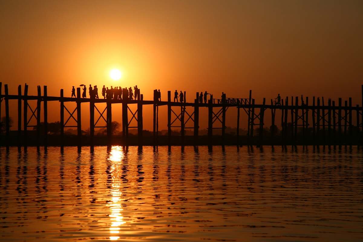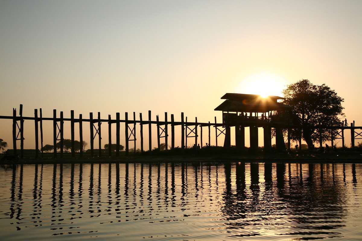 烏本橋建于1851年,長1200米,全橋完全由柚木鉚合而成,是世界上最古老和最長的柚木結(jié)構(gòu)橋。橋柱與橋柱之間相距3米遠,橋柱有1000多根。整座橋相接處沒有使用一顆鐵釘,全靠斗榫。這座橋已經(jīng)歷經(jīng)150年的風(fēng)風(fēng)雨雨,但是依然結(jié)實。