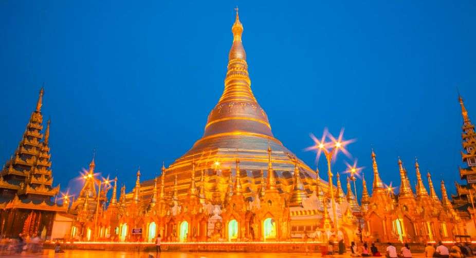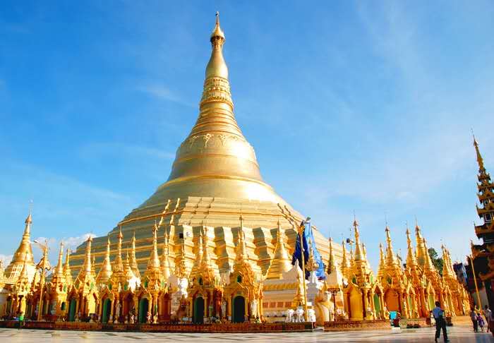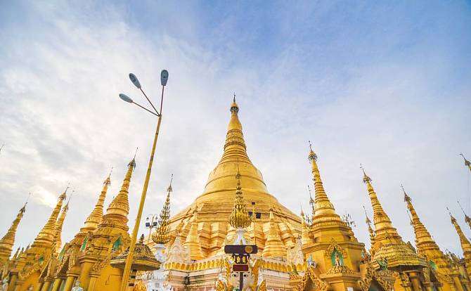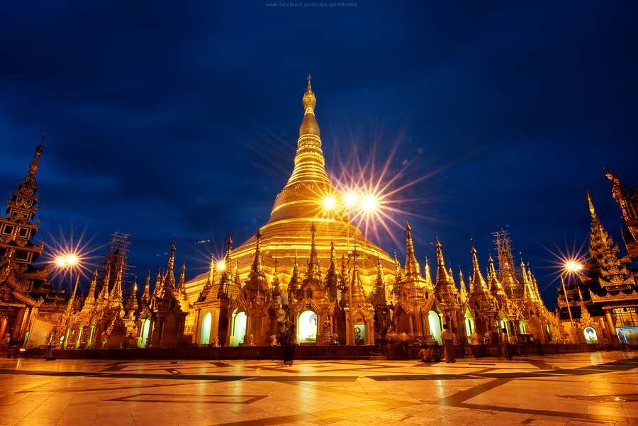 其高度為98米,表面則鋪上了一層金,再加上它是位于皇家圓林西的圣山(Singuttara)之上,所以這座塔也就在仰光市天際線中獨(dú)占鰲頭了。它是緬甸中最神圣的佛塔,因?yàn)樗┓盍怂奈环鹜拥倪z物,包括是拘留孫佛(Kakusandha)的杖,正等覺金寂佛(Konagamana)的凈水器,迦葉佛(Kassapa)的袍及佛祖釋迦牟尼的八根頭發(fā)。全塔上下通體貼金,加上4座中塔、64座小塔,共用黃金7噸多!在塔頂?shù)慕饌闵希€掛有1065個(gè)金鈴、420個(gè)銀鈴,上端以純金箔貼面,頂端鑲有5448顆鉆石和2000顆寶石。