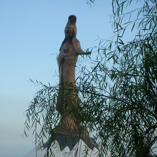 觀音像高20米,整個(gè)蓮花座高7米,直徑為19米,由重50噸青銅制成。觀音蓮花苑以60米長(zhǎng)的小橋與前面陸地連接,其座下的蓮花花瓣共十六枚。觀音像造型簡(jiǎn)潔,雙手抱在胸間,衣裙輕拂,似緩步而行,顯現(xiàn)了優(yōu)美線條與動(dòng)感。觀音容貌安詳,遠(yuǎn)看雙目閉合,近觀則眼睛正觀看世人。