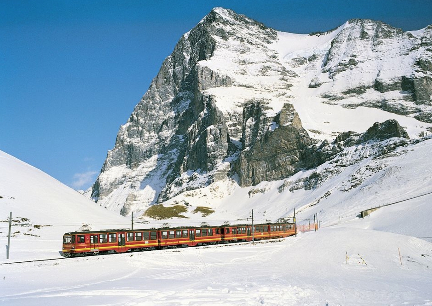 少女峰除了有或秀美或壯麗的阿爾卑斯山地景色可觀賞外,運送游客上山的少女峰登山鐵路本身就是20世紀(jì)初人類的一大工程奇跡。這條鐵路修筑于1896至1912年間,一共用了16年時間,而為了避免滑坡和風(fēng)雪,路線有相當(dāng)長的部分是在艾格峰腹地內(nèi)的隧道中挖掘而出的,這項上世紀(jì)初年實施的工程,直到科技高度發(fā)達(dá)的今天,版權(quán)所有山東聊城聊之旅國際旅行社有限公司,轉(zhuǎn)載必究!仍能讓乘坐者感嘆當(dāng)年開拓者們的無比勇氣和毅力。上山時,齒軌火車會在兩個位于隧洞中的小站稍停五分鐘左右,乘客可以下車,通過隧洞中鑿石開出的幾扇大玻璃觀景窗,欣賞隧洞外面陽光燦爛的冰雪世界。