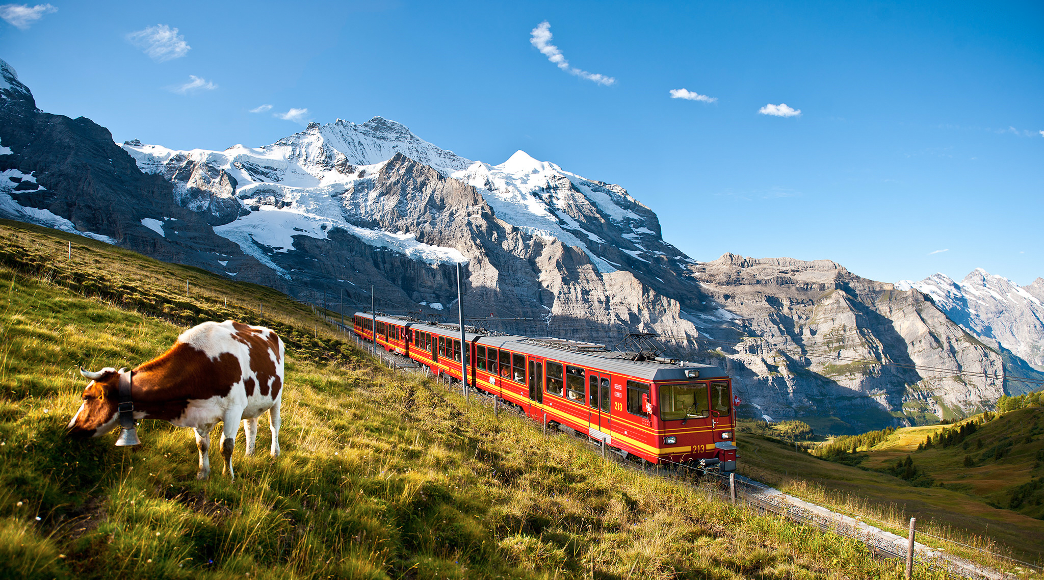 少女峰于1811年才首次由Meyer 兄弟征服。20世紀(jì)初少女峰鐵路(Jungfraubahn)建成,用隧道及齒軌鐵路連接少女峰旁,3,454米(11,333呎)高的小少女峰(Jungfraujoch)。位于小少女峰山內(nèi)的車站亦為歐洲最高的火車站,有“歐洲之巔”之稱。少女峰鐵路由山下Grindelwald 開始,婉延經(jīng)過Eiger 的草地,于Kleine Scheidegg 進(jìn)入隧道。于堅固的花崗巖內(nèi)的隧道雖然只長7 公里,坡度卻達(dá)到25%,于1898-1912年花了14年才完成,它有四分之三左右的路段是在冰河底下隧道巖壁里通過,工程十分艱巨。由Kleine Scheidegg 到少女峰車站,上山需時約50分鐘,下山則需要35分鐘。