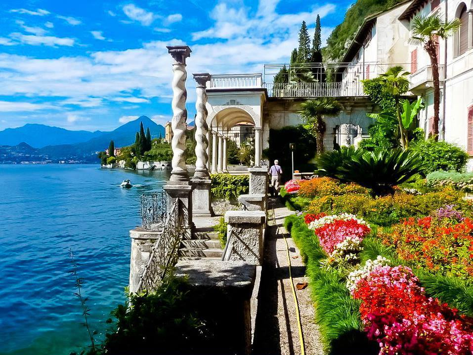 那些石砌房子,有小旅館,陽臺上倚著靠著懶散的度假者,手執(zhí)一杯葡萄酒,或一冊雜志,旁若無人;有露天的咖啡座和餐館,飄出濃郁的咖啡或奶酪的香味;家家戶戶門口石階上花團錦簇。每天午后到黃昏,是小鎮(zhèn)最喧囂的時光,總有游客從不同的地方來,或在小鎮(zhèn)消磨一個溫馨的下午,或乘船在湖上看看風(fēng)景。若是周末,來自周圍其他城市的度假家庭,會遠遠多過國外的觀光客,說科莫湖是米蘭的后花園,一點不假。