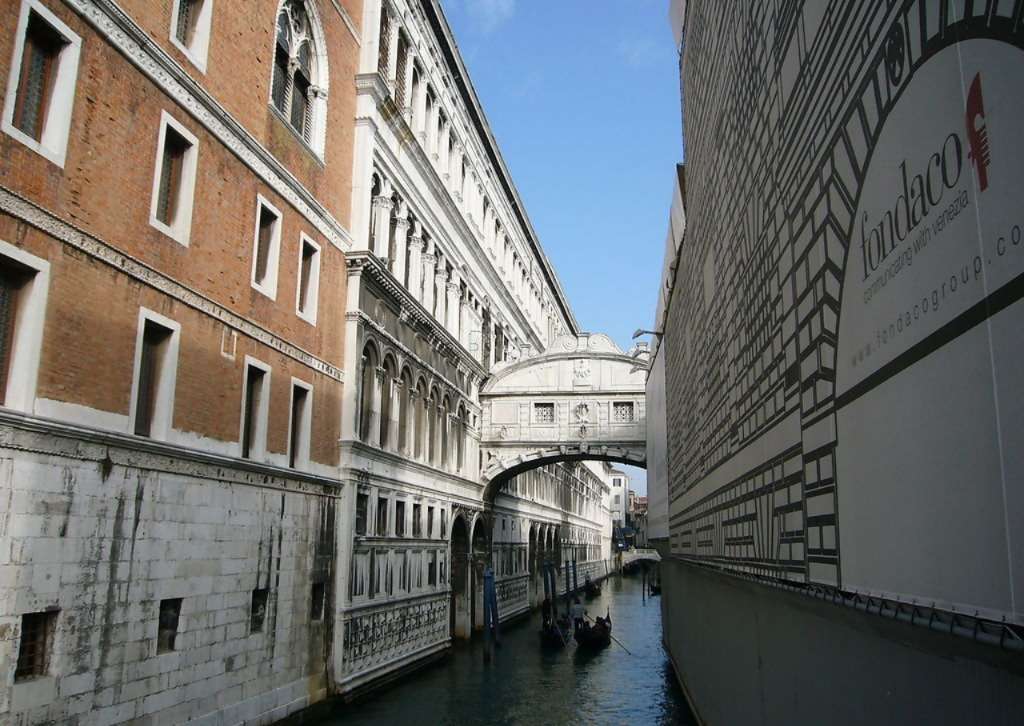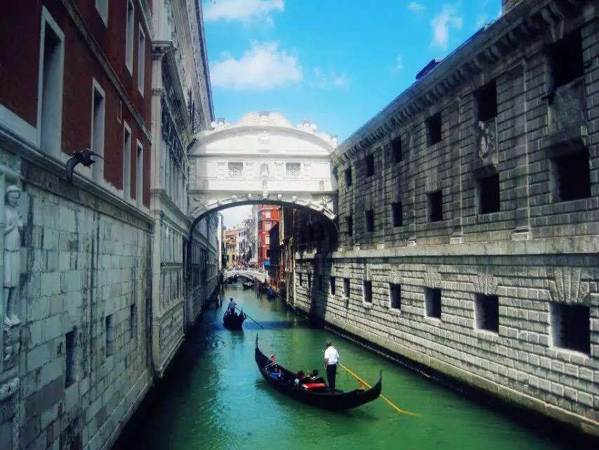 據(jù)說到威尼斯的人,一定要坐威尼斯小艇;坐威尼斯小艇的情侶,一定要經(jīng)過“嘆息橋”,且在橋下?lián)砦??!皣@息橋”不像威尼斯的幾百座橋,供行人穿越。它是座橋,也橫過水面,但高高懸在兩棟樓宇之間。一邊是總督府。白色的大理石上刻著圖案、托著拱形的花窗,據(jù)說在十四世紀(jì)的共和國時代,里面可以同時容納一千六百位王孫貴胄。