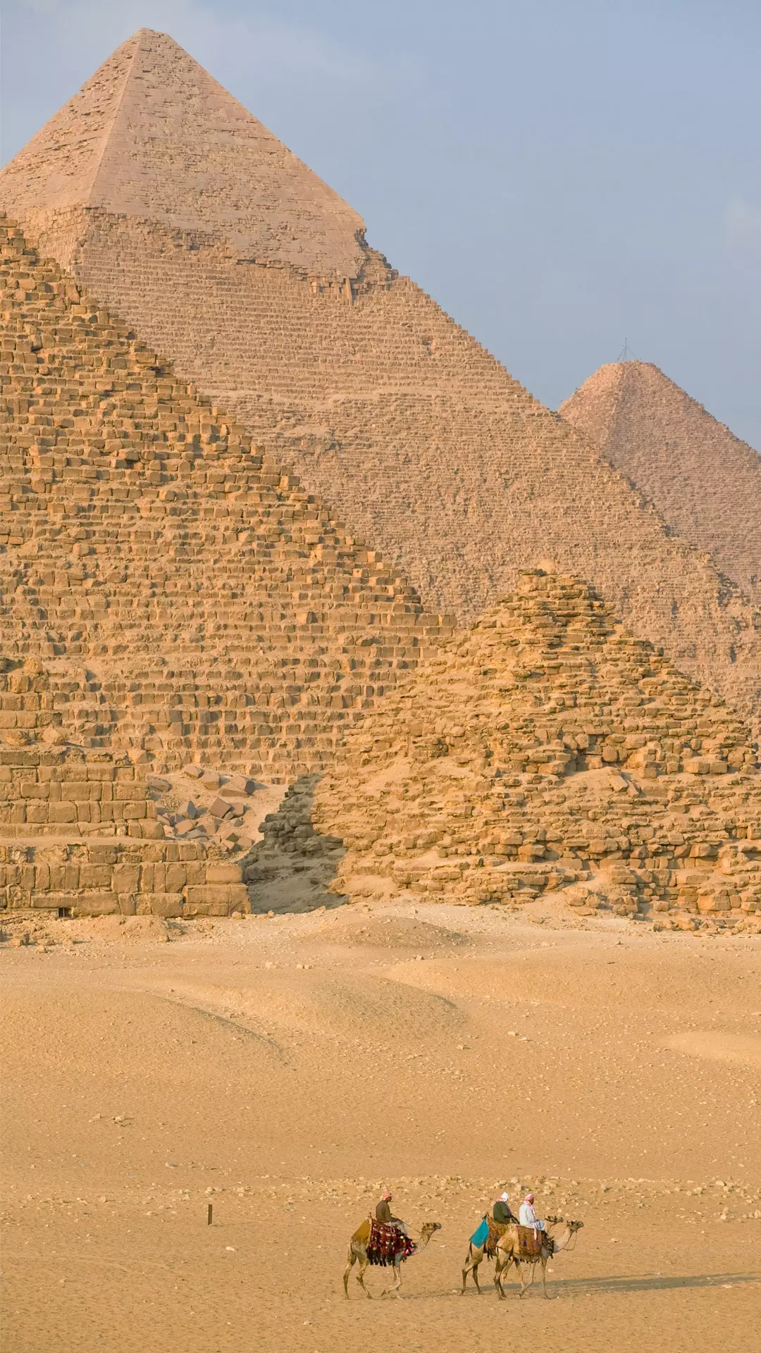 第三座金字塔屬胡夫的孫子門(mén)卡烏拉國(guó)王,建于公元前2600年左右。當(dāng)時(shí)正是第四王朝衰落時(shí)期,金字塔的建筑也開(kāi)始被腐蝕。門(mén)卡烏拉金字塔的高度突然降低到66米,內(nèi)部結(jié)構(gòu)倒塌。三座金字塔石塊,可在法國(guó)國(guó)境四周建造一道高三公尺,厚三十公分圍墻。金字塔的斜度都是五十二度,每一石塊密密相連,休想找到縫隙,連刀尖也都插不進(jìn),不得不佩服古埃及的度量及工程等一些技術(shù)。