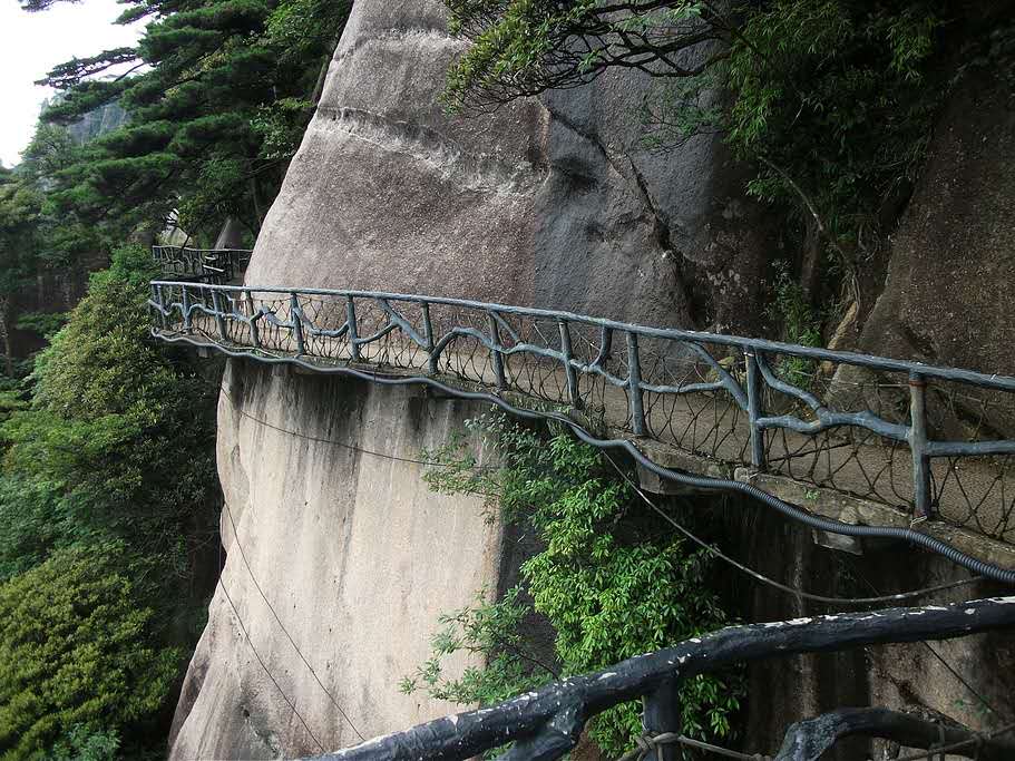 在海拔約1600米的高山懸崖絕壁上,橫空出世,向外懸挑出一條全長(zhǎng)約3700米,寬1.3米至2米的鋼筋混凝土棧道。因其中有2700米不見(jiàn)臺(tái)階,宛若玉帶,平整如岸,故名西海岸。由三清山風(fēng)景名勝區(qū)管委會(huì)于2002年6月建竣。