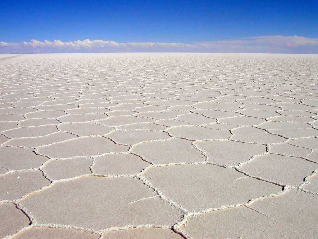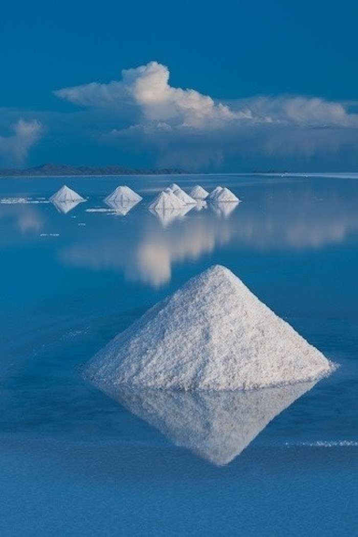 在高原南端有一些冰川融化時(shí)留下的鹽湖,而在1萬(wàn)年前最后一個(gè)冰期(第四紀(jì)冰期)結(jié)束時(shí),湖水已逐漸消失。高原上最大并最令人印象深刻的就是烏尤尼鹽沼(Salar de Uyuni)。每年夏季(雨季12月至次年1月),它被雨水注滿(mǎn),形成一個(gè)淺湖;而每年冬季(旱季7月至10月),湖水則干涸,留下一層以鹽為主的礦物質(zhì)硬殼,中部達(dá)6米厚。人們可以駕車(chē)駛過(guò)湖面。尤其是在雨后,湖面像鏡子一樣,反射著好似不是地球上的、美麗的令人窒息的天空景色,這也就是傳說(shuō)中的“天空之鏡”。由于面積空曠,極其光滑(覆蓋著淺水),同時(shí)又極平整(海拔差異極小),地表反射率極高,使阿塔卡瑪成為一個(gè)理想的測(cè)試和校準(zhǔn)地球遙感衛(wèi)星之地。