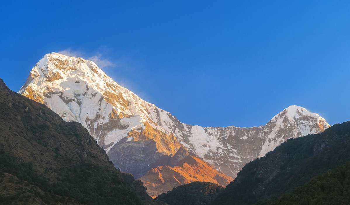 魚尾峰雖然不是尼泊爾最高的山峰,但卻成為尼泊爾的標志。從波卡拉的費娃湖附近,可以看到這座圣山和周圍峰群,突出于較低的山巒之上。