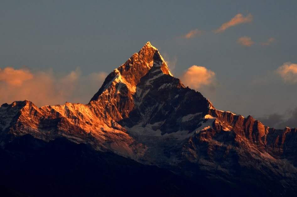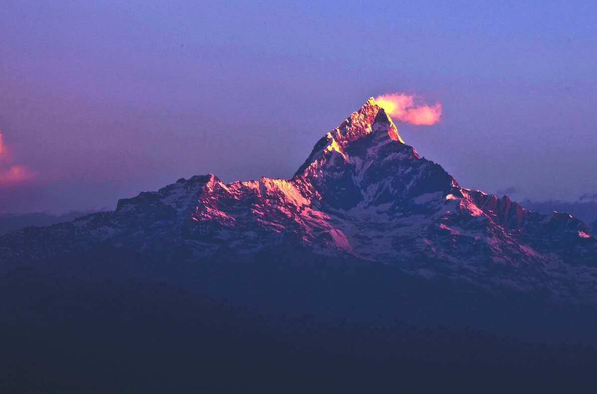 魚(yú)尾峰雖然不是尼泊爾最高的山峰,但卻成為尼泊爾的標(biāo)志。從波卡拉的費(fèi)娃湖附近,可以看到這座圣山和周圍峰群,突出于較低的山巒之上。