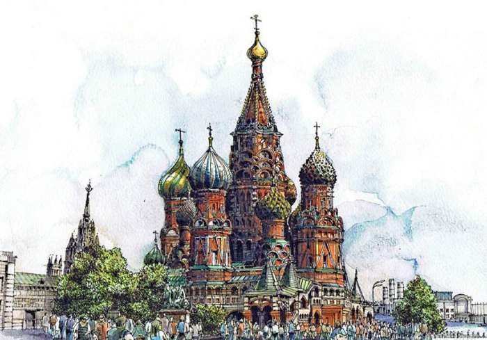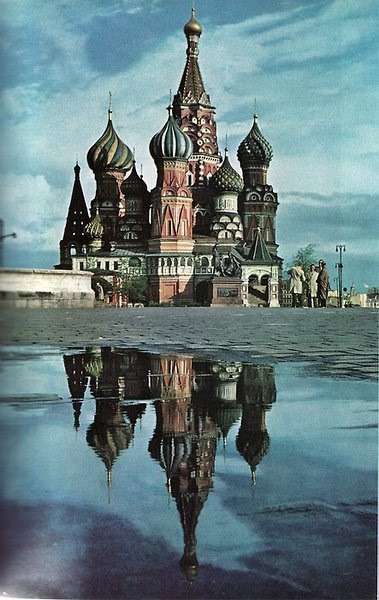 圣瓦西里大教堂于1553-1554年為紀(jì)念伊凡四世戰(zhàn)勝喀山汗國(guó)而建(由7個(gè)木制小教堂組成),并于公元1555年—公元1561年奉命改建為9個(gè)石制教堂,造型別致,多奇異雕刻,主臺(tái)柱高57米,為當(dāng)時(shí)莫斯科最高建筑。