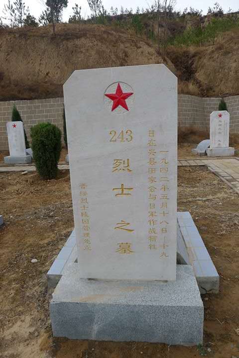 正面朝北、東西走向的深紅色大理石陵墓上,稍靠西側(cè)陳設(shè)著鋼盔和軍旗的青銅雕塑,造型簡潔明快,蘊意肅穆深長。墓前有一個凸型五星狀的火炬,五星中央噴出的火焰,從建成時一直燃燒,從未熄滅,它象征著烈士的精神永遠光照人間。