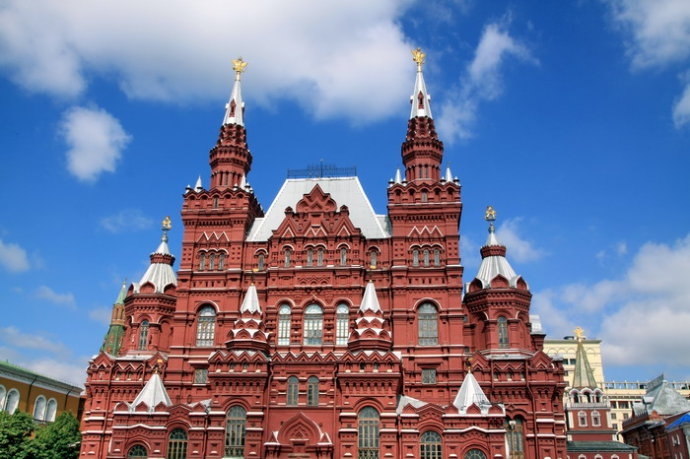 俄羅斯國家歷史博物館(The State Historical Museum)位于俄羅斯莫斯科紅場(chǎng)北側(cè)的馬涅什廣場(chǎng)上,是一座建筑造型非常美麗且極具新俄羅斯風(fēng)格的朱紅色建筑物;在主體建筑物的兩側(cè)各有一座高聳對(duì)稱的塔樓,還有裝飾性的尖塔、三角檐與圓拱型窗戶。