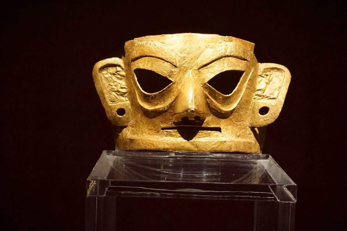 黃金面具寬19.5厘米、高11厘米、厚0.04厘米,重46克。其造型與小金面具有所不同,整體呈立體臉譜,表現(xiàn)范圍上限于額部,下方及下頜。面相近方,平額,眉毛略微凸起,中央寬而兩端收束,好似新月。眼眶較大,雙眼鏤空約呈菱形,上眼簾呈弧形,下眼簾深凹。鼻梁高直,鼻翼與顴骨線相連。嘴巴鏤空呈扁長方形,略呈笑意。耳朵外展,上寬下窄,耳垂穿孔。嘴巴微張,呈狹長方形,下頜平直。整個(gè)臉部豐滿,表情威嚴(yán),具有一定寫實(shí)風(fēng)格。從金面具背面的痕跡觀察,推測此器可能是附著在某種物體之上,應(yīng)是古蜀時(shí)期的神祗面具。此件面具與三星堆遺址一、二號坑中出土的青銅人頭像、青銅人面具在造型風(fēng)格上基本一致,再次證明了金沙遺址與三星堆遺址有著緊密的承襲關(guān)系。