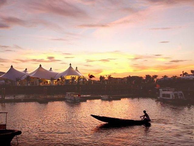 博鰲亞洲論壇會(huì)址建在三河出??诘奈髂习哆叄晌鍌€(gè)巨大白色帳篷組成,遠(yuǎn)眺似天空飄浮的五朵白云;東面是三河出??诘母共?,前面寬闊的港灣和沙白如銀的玉沙帶;西面和南北面系博鰲水城,別墅星羅棋布。夜晚,萬(wàn)盞彩燈競(jìng)亮,猶如天上人間。