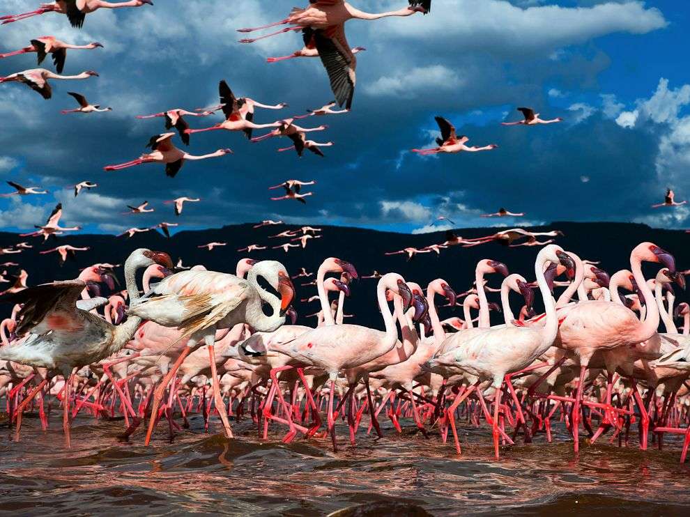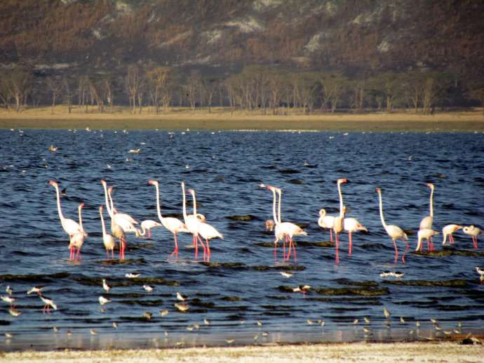 東非大裂谷還是一座巨型天然蓄水池,非洲大部分湖泊都集中在這里,大大小小約有30來個(gè),例如阿貝湖、沙拉湖、圖爾卡納湖、馬加迪湖、馬拉維湖、坦噶尼喀湖等。這些裂谷帶的湖泊,水色湛藍(lán),遼闊浩蕩,千變?nèi)f化,不僅是旅游觀光的勝地,而且湖區(qū)水量豐富,湖濱土地肥沃,植被茂盛,野生動(dòng)物眾多,大象、河馬、非洲獅、犀牛、羚羊、狐狼、紅鶴、禿鷲等都在這里棲息。坦桑尼亞、肯尼亞等國政府,已將這些地方辟為野生動(dòng)物園或者野生動(dòng)物自然保護(hù)區(qū),比如,位于肯尼亞峽谷省省會(huì)納庫魯近郊的納庫魯湖,是一個(gè)鳥類資源豐富的湖泊,共有鳥類400多種,是肯尼亞重點(diǎn)保護(hù)的國家公園。在結(jié)眾多的鳥類之中,有一種名叫弗拉明哥的鳥,被稱為世界上最漂亮的鳥,一般情況下,有5萬多只火烈鳥聚集在湖區(qū),最多時(shí)可達(dá)到15萬多只。當(dāng)成千上萬只鳥兒在湖面上飛翔或者在湖畔棲息時(shí),遠(yuǎn)遠(yuǎn)望去,一片紅霞,十分好看。