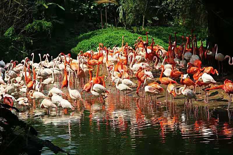 亞馬遜雨林位于南門入口,這里有一片霧氣彌漫的雨林中心,這里正是成百只火烈鳥的家,火紅的火烈鳥把綠意盎然的島變成了火燒島,熱鬧而聒噪的火烈鳥叫聲顯示出這片雨林無限的活力。游客可以選擇環(huán)湖綠道或者熱帶雨林小道兩條路線進(jìn)行參觀:綠道可以欣賞雨林全貌,而小道也是觀景也是別有風(fēng)味,可以沿途觀賞多種珍稀植物。行走于熱帶雨林小道深入到雨林區(qū)的核心,為了模擬雨林的濕氣和生態(tài),沿途安裝了高科技噴霧裝置,即使在炎炎夏日,行走在雨林小道,仿佛如行走在真正的熱帶雨林一般涼爽濕潤。