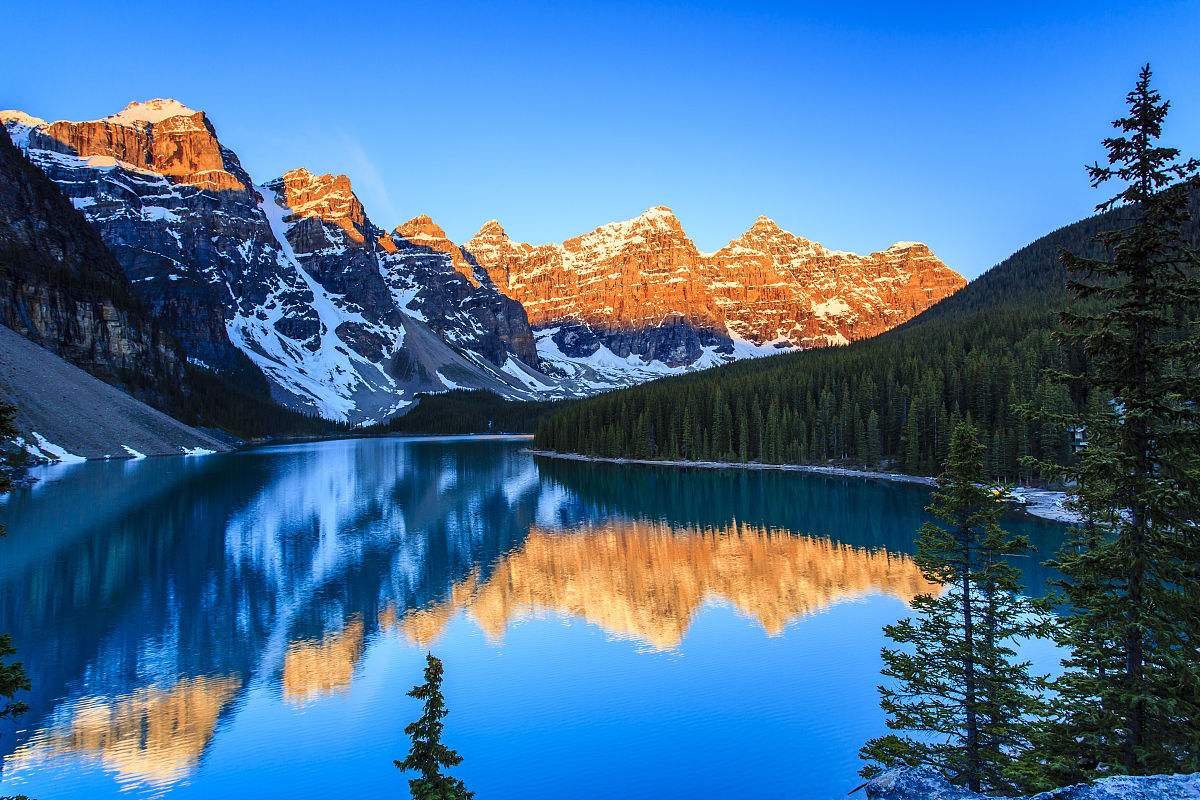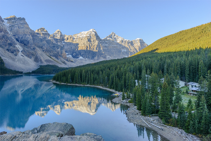 由于夢(mèng)蓮湖是一個(gè)冰川湖,因此只有到每年六月底,湖水才到達(dá)最高線,折射沉積的巖粉,呈現(xiàn)出美麗的藍(lán)綠色。夢(mèng)蓮湖被世界公認(rèn)為是最有拍照身價(jià)的湖泊。湖面呈寶石藍(lán)色,晶瑩剔透,在鋸齒狀的山谷的擁環(huán)下,就像一塊寶玉。這塊“國(guó)寶”被印在加拿大20元的紙幣上。
