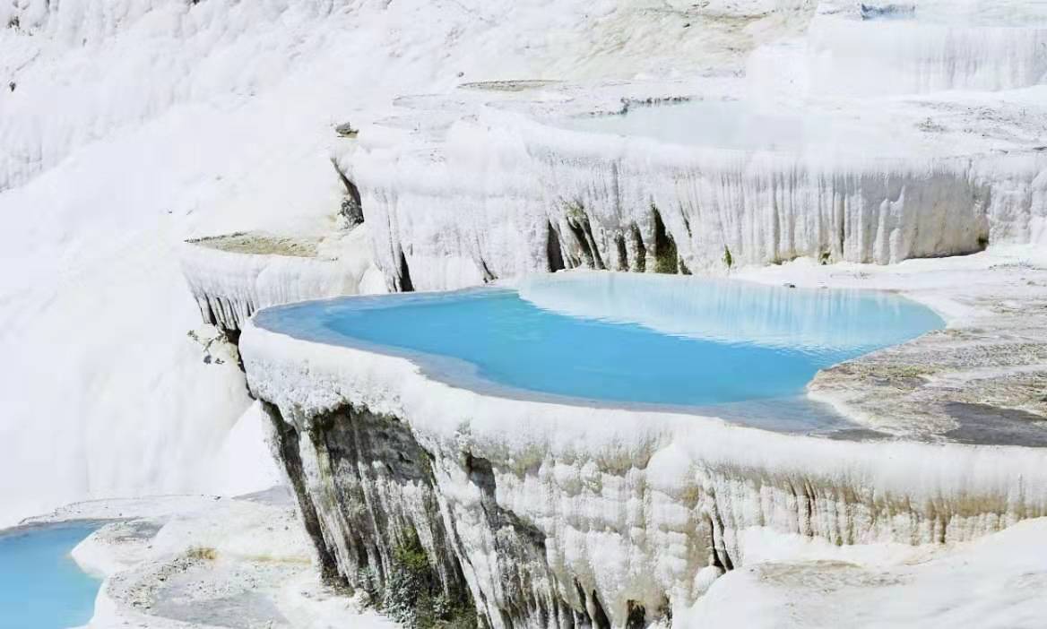 棉花堡位于土耳其西南部代尼茲利(Denizli)市,如此可愛的名字,源自其外形像鋪滿棉花的城堡。所謂“棉花”,就是泉水從山頂往下流,所經(jīng)之處歷經(jīng)千百年鈣化沉淀,形成層層相疊的半圓形白色天然石灰?guī)r階梯,所以土耳其人叫它“棉花堡”。棉花踩上去并不光滑,棉花堡的泉水深淺不一,有些只及腳踝,有些可及腰部。水溫終年保持在36到38攝氏度,水的酸堿值大概6左右。據(jù)科學鑒定,泉水富含鈣、鎂等礦物質,以每秒400公升的速度流動,不但對風濕、皮膚病、婦科病、消化不良及神經(jīng)衰弱等有神奇療效,泉水還可飲用。