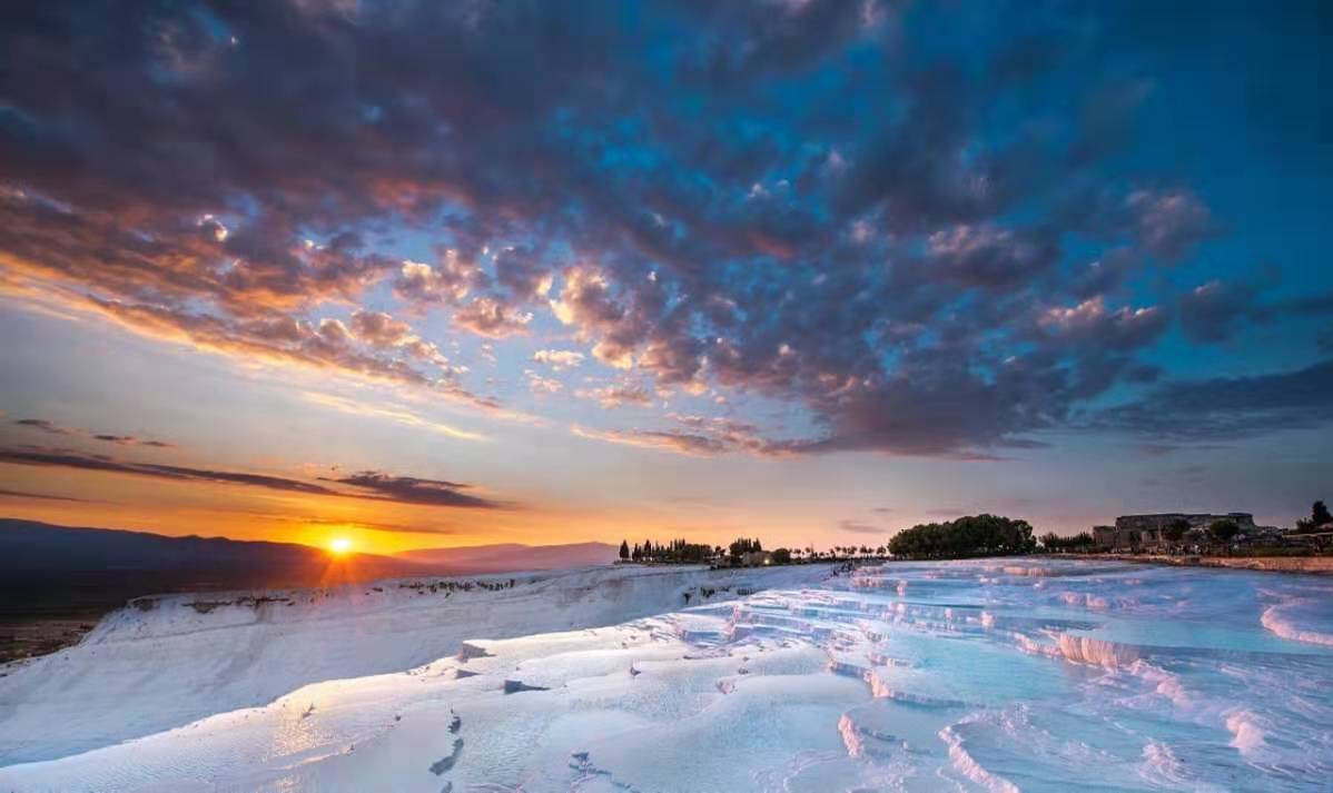 最不能錯過棉花堡的日落,當太陽的光芒一點點由金色變成緋紅殷紅桃紅玫瑰灰,棉花堡會像一朵最綺麗的蓮花,幻化出難以置信的光影奇跡:白色的巖面會被陽光點染出淡淡的色彩,而巖面中水波則忠實地記錄下天空變幻的奇異色彩。
