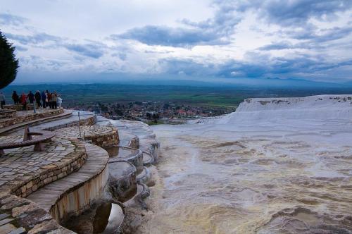 從平原之上200米高的巖石中流出的泉水和水中的方解石形成了帕姆卡拉(土耳其語(yǔ)中意為“棉花宮殿”)這一特殊地貌。它由石林、石瀑布和一系列的梯形盆地組成。公元前2世紀(jì)末阿塔利德斯王朝的帕加馬國(guó)王們建立了希拉波利斯溫泉站。這處遺址包括浴室的廢墟、廟宇和其它希臘建筑。