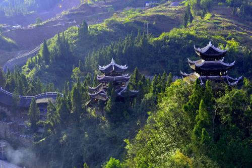 九黎宮:科學(xué)利用山水自然資源,因地制宜、依山造勢(shì),順山而居。宮高99米,呈11開(kāi)間,象征九九歸一之意。建筑由四合院到吊腳樓到?jīng)_天樓三合為一,九黎宮內(nèi)有苗族接龍?zhí)谩駱腔⒖谔?、四合院、八字朝門(mén)和吊腳樓群等多種文化符號(hào),是彭水展示苗族文化、民風(fēng)民俗的博物館,是目前最大的吊腳樓群。