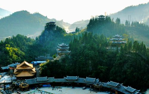 蚩尤九黎城位于重慶市彭水縣紹慶街道與靛水街道結(jié)合部的亭子壩,東經(jīng)摩圍山隧道與彭水老城區(qū)相連,南接彭水新城,北至烏江并與湘渝高速下線互通??偨ㄖ娣e11萬(wàn)平方米, 是國(guó)家AAAA級(jí)旅游景區(qū)。景區(qū)以苗族始祖蚩尤文化為主線,由40余處單體景觀建筑構(gòu)成,集苗族文化、旅游景區(qū)、游客接待于一體,繼承和延續(xù)了苗族歷史文化、民俗風(fēng)情,重現(xiàn)“九黎之城”歷史風(fēng)貌,是展示和傳承苗族文化的窗口和基地,彰顯出的是苗族文化的厚重和豐富的內(nèi)涵。已經(jīng)成為彭水最閃亮的城市名片、旅游名片,成為渝東南乃至湘鄂川黔渝邊區(qū)旅游廊道上璀璨的明珠。