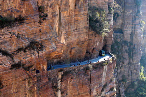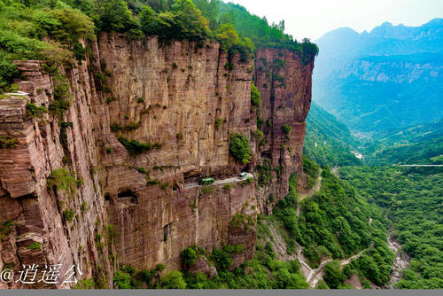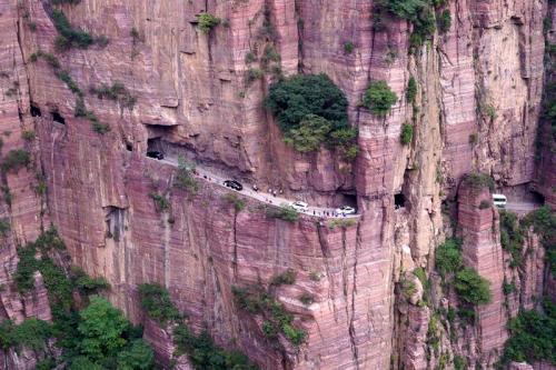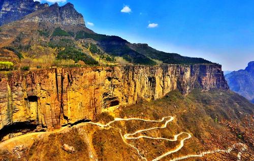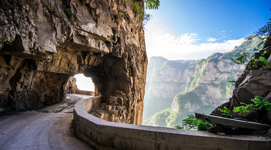 太行山大峽谷中共有六條掛壁公路,其中數郭亮村到王莽嶺的“昆山隧道"最為壯觀(郭亮村到王莽嶺最近的一條路),歷經30年,人工開鑿了一條由山西陵川王莽嶺通往河南輝縣郭亮的掛壁公路。