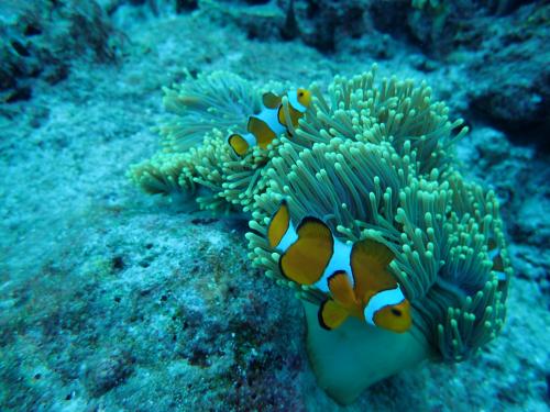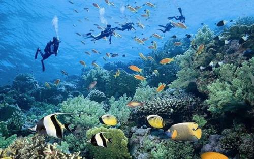 涉足觀魚:即使沒有受過潛水訓練,也絕對可以享受潛水觀魚的樂趣。戴上面罩,撲在海面上向下看,近距離欣賞美麗的珊瑚,五顏六色的熱帶魚從身邊游過,尤其是紅色的大魚,很讓人驚奇,30米外便有如懸崖般的落差,但這里也是魚兒最多的地方。在陽光的照射下,海底世界美得如夢如幻。一會兒,一大群黑色的魚群游過來,不一會兒又有一大群白魚從身邊穿過。運氣好的話,可見到小鯊魚和魔鬼魚。