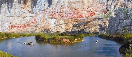 廣西左江流域的寧明、龍州、崇左、扶綏、大新、天等、憑祥等縣市的沿江地區(qū)都分布有崖壁畫,共79處,這些崖壁畫多集中在江河轉(zhuǎn)彎處寬大、平整、垂直壁上,陸地石壁和洞穴也有少量分布,花山崖壁畫是其中規(guī)模最大的,全幅畫長135米,高44米,分布在寧明縣明江耀達河段的花山崖壁上,畫有朱紅色人物1300多個;最大的高達3米,最小的僅0.3米,間有少量獸類和器具,規(guī)模宏大,內(nèi)容十分豐富。所畫人物有雙腳“八字”蹲、兩手上舉和雙腳下彎、兩臂前撐等姿態(tài)。每組畫中,常見一高大的人位于人群中央,腰佩刀劍,旁邊有銅鼓、狗和馬等形象,似是作戰(zhàn)會師、慶祝大會或集體娛樂等場面。據(jù)專家考證,這些崖壁畫繪制于戰(zhàn)國早期至東漢之間,是壯族先民通過圖騰崇拜以祈求五谷豐登、人丁興旺,其線條粗?jǐn)U,造型古樸,歷經(jīng)數(shù)千年風(fēng)雨侵蝕,依然清晰可見,不僅在廣西,在世界上也極為罕見。