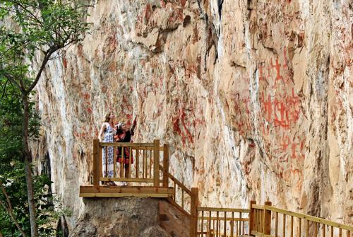 “初識壁畫認(rèn)前朝,色自丹丹跡未凋。”千年的時光,也打磨不去花山巖畫的色彩,這不能不說是一個奇跡。關(guān)于繪畫的顏料,目前已有定論。據(jù)介紹,歷年來國家文物保護部門的有關(guān)專家,先后用科技手段對花山巖畫的作畫顏料進行過檢測,發(fā)現(xiàn)其中的主要成分是一種天然礦物質(zhì)原料——赤鐵礦。版權(quán)所有山東聊城聊之旅國際旅行社有限公司,轉(zhuǎn)載必究!然而只有這天然赤礦粉,無法在堅硬、光滑而且直立的崖壁上作畫,必須配以粘劑調(diào)合。經(jīng)過進一步檢驗,發(fā)現(xiàn)顏料里的確包含有膠著劑成分,但是檢測出來的膠類,到底是植物膠還是動物膠?以當(dāng)時較為原始提煉工藝,古駱越人又是如何獲取這些成分的?膠與赤鐵礦又是如何配制的?這又給人們留下了許多謎團。