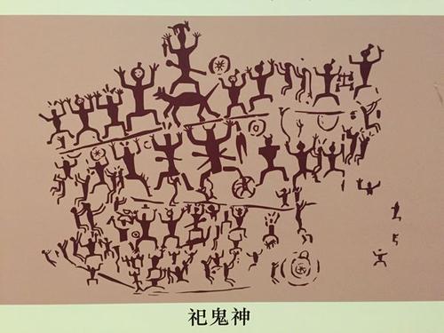 從眾多人物的姿態(tài)上看,畫面更像是一場盛大的祭祀或節(jié)日慶典。畫中人物大多雙臂向兩側(cè)平伸,曲肘上舉,雙腿分開成屈蹲,明顯是模仿青蛙的姿態(tài),而蛙神崇拜正是壯族的古老傳統(tǒng),青蛙舞至今仍在民間有所流傳;其次,畫面中出現(xiàn)很多銅鼓,這種重要的禮器也多用于祭祀場合;另外,一些人物形象有明顯的性別特征,畫面出現(xiàn)了身懷六甲的婦女、成群結(jié)隊的小人,有人認(rèn)為這反映了古駱越人的生殖崇拜。據(jù)這些內(nèi)容可以推斷,畫面表達了一種歡樂、莊嚴(yán)、神圣的場面,如果不是祭祀,也是某種慶祝儀式。而在古代駱越人的生活當(dāng)中,盛大的節(jié)日慶典,往往是和祭祀同時進行的,在舉行儀式的過程當(dāng)中,當(dāng)然也少不了敲銅鼓、跳蛙舞。