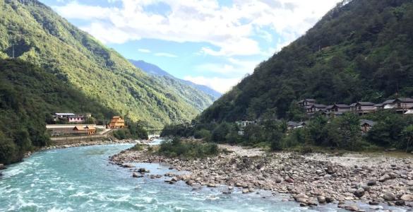 丙中洛境內(nèi)有國家級4A景點3個,怒江第一灣、石門關(guān)和丙中洛田園風(fēng)光,省政府批準(zhǔn)的一級景點2個,二級景點6個,三級景點3個。丙中洛呈不規(guī)則四邊形,地勢北高南低,最高峰嘎娃嘎普雪山5128米,終年積雪。最低海拔為與捧當(dāng)鄉(xiāng)交界處江面1430米。鄉(xiāng)政府駐地丙中洛壩子海拔1750米,面積約為15平方公里,四面環(huán)山,整個壩子被念瓦洛河和格馬洛河分割成三大塊,平壩周圍的石崖多為羊脂玉巖,南為貢當(dāng)神山,北為石門關(guān),南北遙相呼應(yīng),怒江從北部的秋那桶深谷進(jìn)入丙中洛,從丙中洛南邊一直到大拉,形成彎彎曲曲幾道彎,最大的一道彎在坎桶被稱為“怒江第一灣”。