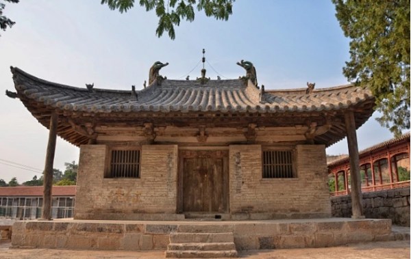 天臺庵,建筑面積90余平方米,現(xiàn)僅存正殿和一通石碑。正殿建于1米高的石臺基上。面闊7.15米,進深7.12米。單檐歇山頂,簡板布瓦,琉璃脊獸,屋坡舉折平緩,四翼如飛。檐下四周設(shè)臺明,正面明間臺明下安裝踏跺。殿身四周為圓木柱,柱間施闌額,無普拍枋,柱礎(chǔ)為覆盆式,柱頭卷殺較緩,柱上安有斗拱承托屋檐。殿內(nèi)無柱,四椽栿通達前后檐柱,結(jié)構(gòu)簡練,相交嚴實,無繁雜裝飾之感,使殿內(nèi)空間顯得更大,與五臺山南禪寺大殿的建筑結(jié)構(gòu)相近,體現(xiàn)唐代建筑的特點。