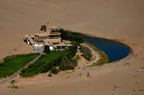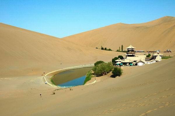 鳴沙山位距敦煌市南郊5公里,因沙動(dòng)成響而得名。山為流沙積成,分紅、黃、綠、白、黑五色。漢稱沙角山,又名神沙山,魏晉時(shí)始稱鳴沙山。其山東西綿亙40余公里,南北寬約20余公里,沙壟相銜,盤(pán)桓回環(huán)。其特點(diǎn):“峰巒陡峭,山脊如刃;馬踐人馳,殷殷有聲;輕若絲竹,重如雷鳴;沙隨足落,經(jīng)宿復(fù)初。”