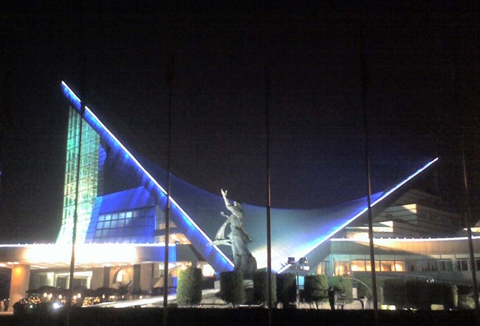 星海音樂廳臨珠江而建,充滿現(xiàn)代感的雙曲拋物面幾何體結(jié)構(gòu)雄偉壯觀,是一座令人贊賞的藝術殿宇。自北向南斜望,音樂廳像一只展翅欲飛的天鵝,從西往東看,南面的拋面與二樓平臺構(gòu)成一架撐起蓋面的大鋼琴,與珠江的碧水合奏著永不休止的和弦;晴日里,從兩條拋物面的弧形脊看旭日噴薄而出和夕陽西墜,又似五線譜上圓圓的音符。