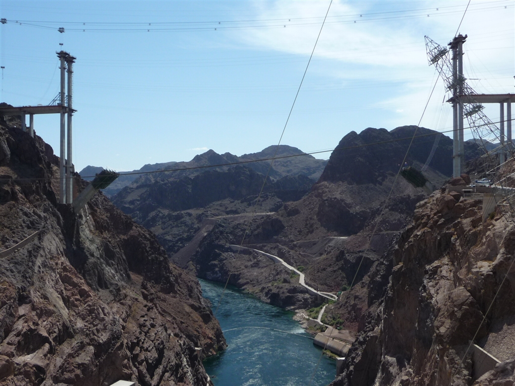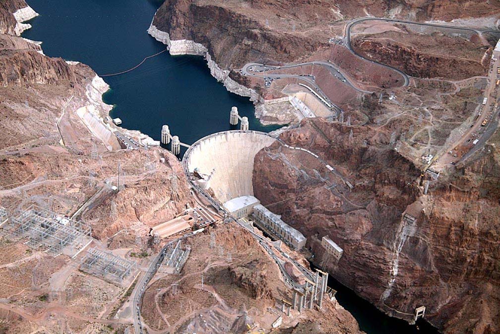 胡佛水壩(Hoover Dam)是美國綜合開發(fā)科羅拉多河(Colorado)水資源的一項關(guān)鍵性工程,位于內(nèi)華達(dá)州和亞利桑那州交界之處的黑峽(Black Canyon),具有防洪、灌溉、發(fā)電、航運、供水等綜合效益。 大壩系混凝土重力拱壩,壩高221.4m,大壩形成的水庫叫米德(Mead)湖,總庫容348.5億立方米,水電站裝機(jī)容量原為134萬kW,現(xiàn)已擴(kuò)容到208萬kW,計劃達(dá)到245.2萬kW。于1931年4月開始動工興建,1936年3月建成,1936年10月第一臺機(jī)組正式發(fā)電。