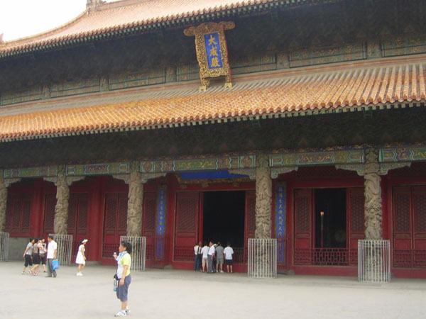 洙水橋北,先是一座綠瓦三楹的高臺大門——擋墓門,后面就到了供奉孔子木主的享殿。去享殿的甬道旁,有四對石雕,名曰華表、文豹、角端、翁仲。華表系墓前的石柱,又稱望柱;文豹,形象似豹,腋下噴火,溫順善良,用以守墓;角端,也是一種想象的怪獸,傳說日行1萬8千里,通四方語言,明外方幽遠之事;翁仲,石人像,傳為秦代驍將,威震邊塞,后為對稱,雕文、武兩像,均稱翁仲,用以守墓。兩對石獸為宋宣和年間所刻,翁仲是清雍正年間刻制的,文者執(zhí)笏,武者按劍。甬道正面是享殿,殿廣5間,黃瓦 歇山頂,前后廊式木架,檐下用重昂五踩斗栱。殿內現(xiàn)存清帝弘歷手書“謁孔林酹酒碑”,中有“教澤垂千古,泰山終未頹”等詩句。解放戰(zhàn)爭時,朱德總司令曾在此殿內召開過軍事會議。