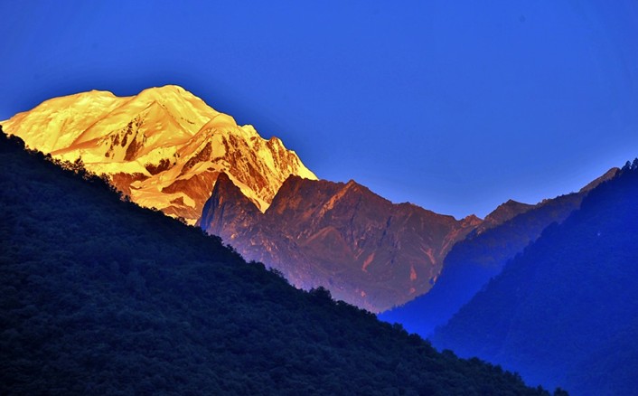 貢嘎山(Minya Konka)位于四川省康定以南,是大雪山的主峰。周圍有海拔6,000公尺以上的山峰45座,主峰更聳立于群峰之巔,海拔7,556公尺。高出其東側(cè)大渡河6,000公尺,被喻為「蜀山之王」。主峰由花崗閃長巖組成,受海洋季風(fēng)影響,雪線海拔4,600~4,700公尺,冰川發(fā)育規(guī)模較大。東坡最大的海螺溝冰川長14.2公里,末端下達(dá)2,850公尺,已落入森林帶內(nèi),在長期冰川作用下,山峰發(fā)育為錐狀大角峰,周圍繞以60°~70°的峭壁,攀登困難。1932年,美國探險(xiǎn)隊(duì)攀登成功。中國大陸登山隊(duì)于1957年6月到達(dá)峰頂。
